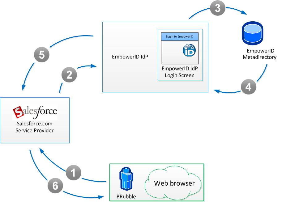 - The EmpowerID IdP generates a federation assertion, signs and encrypts it, and redirects BRubble's browser to Salesforce.