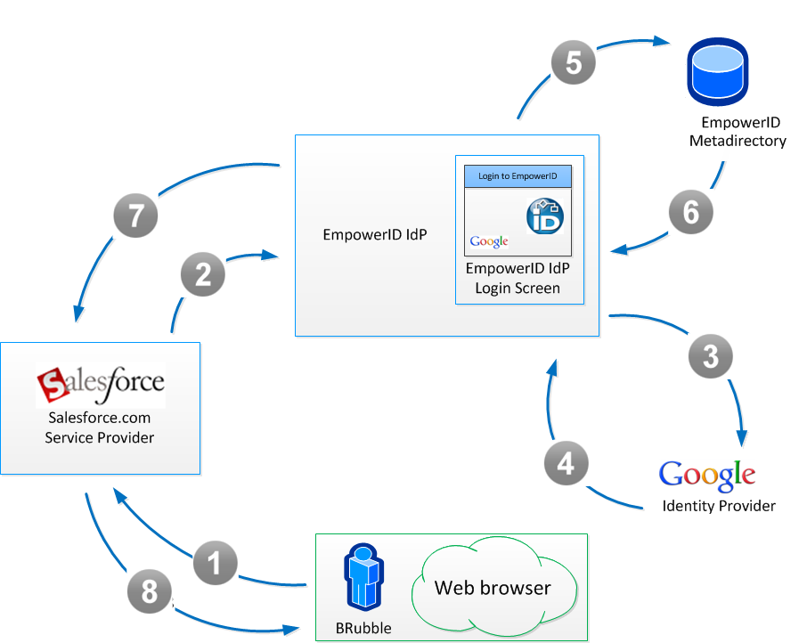- The EmpowerID IdP redirects BRubble's browser to Salesforce with an assertion of her identity.
