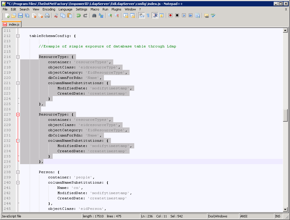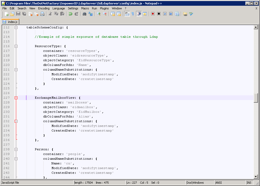 - Navigate to the TheDotNetFactory > EmpowerID > LdapServer >EidLdapServer > config folder and locate the index.js file in that folder.
