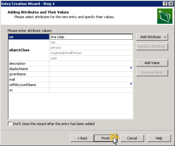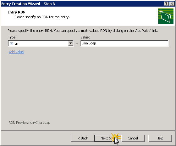 - Specify cn as the RDN type, enter the appropriate value for the type and then click Next.