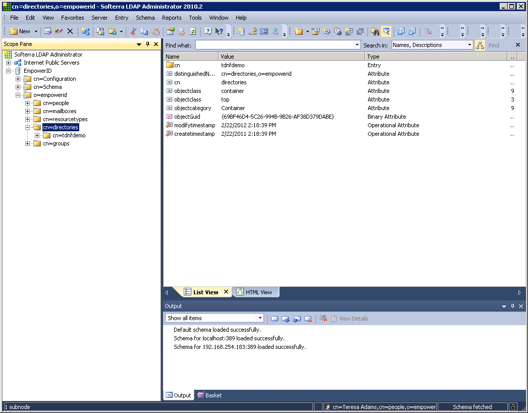 - From your LDAP management tool, navigate to the EmpowerID root tree node and then expand the o=empowerid and cn=directories nodes.