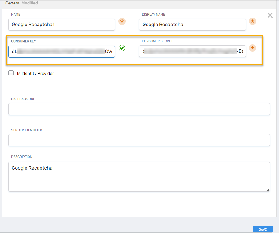 This opens the External OAuth Provider Details for reCaptcha. You use this view to add your provider details.