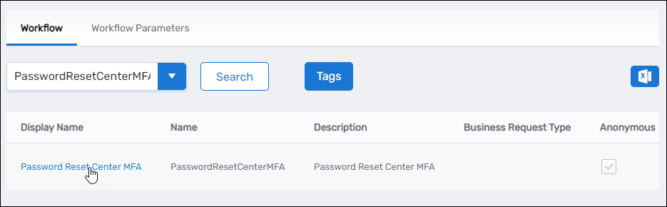 - On the Workflow tab, search for PasswordResetCenterMFA and click the Display Name link for the workflow.