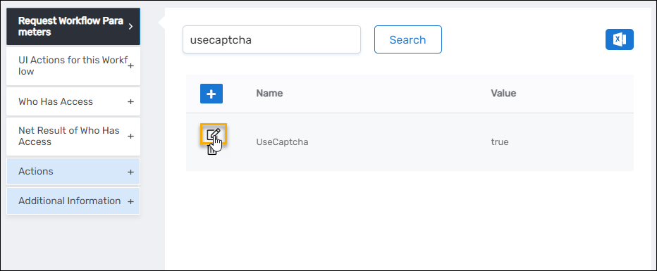 - In the search results, click the Edit button for the UseCaptcha parameter, which is set to true by default.