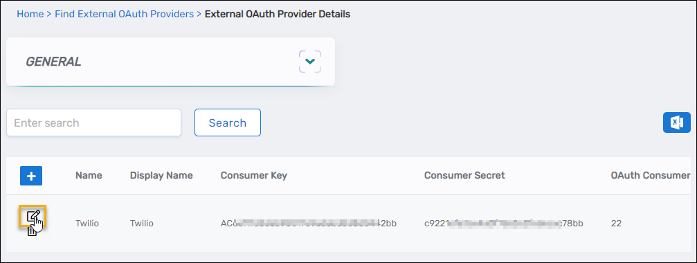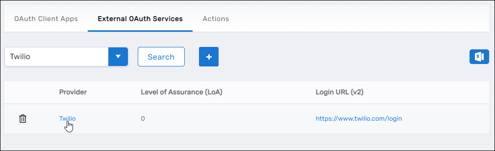 - Select the External OAuth Services tab, search for Twilio, and click the Provider link.