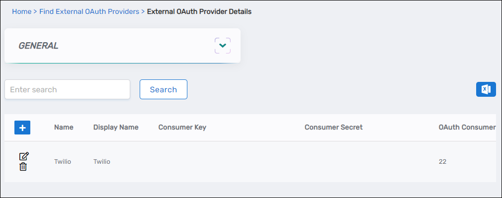 Clicking on the link opens the External OAuth Provider Details page for Twilio. In the below image, the General panel is collapsed.