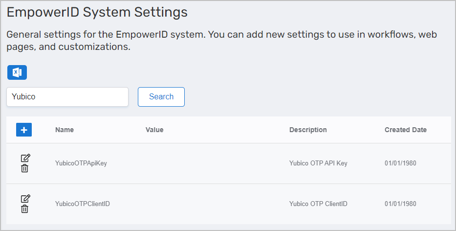 - In the grid, click the Edit button for the YubicoOTPApiKey setting.