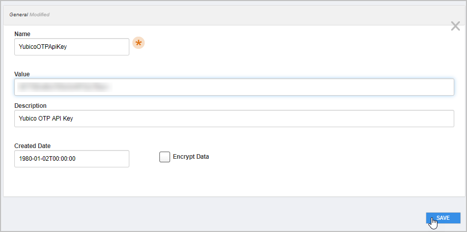 - In the dialog that appears, enter the Secret Key you received from Yubico in the Value field and click Save.