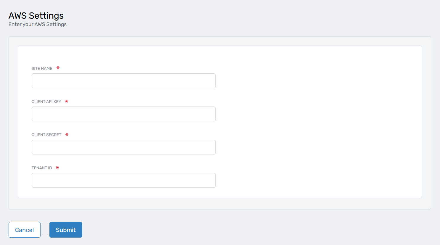 This opens the AWS Settings form, which is where you enter information about your Amazon AWS instance needed to connect EmpowerID to it.