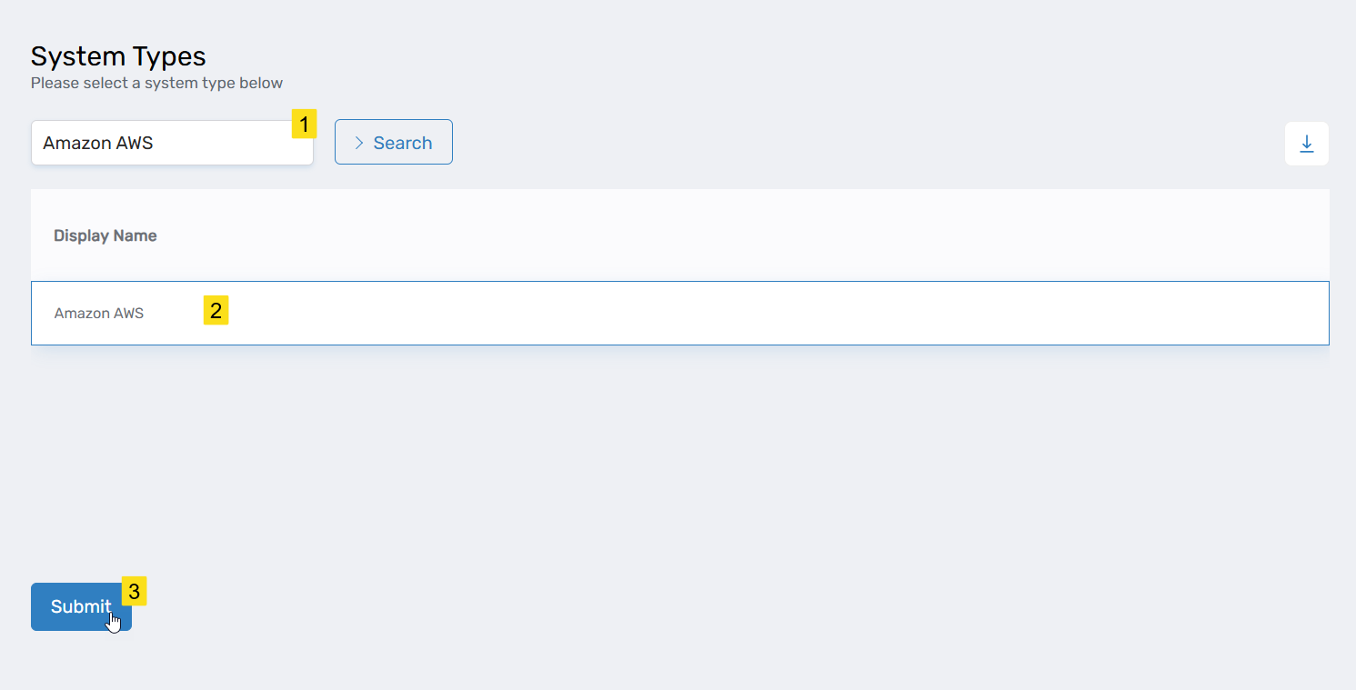 Under System Types, seach for Amazon AWS, select the corresponding record, and click Submit.