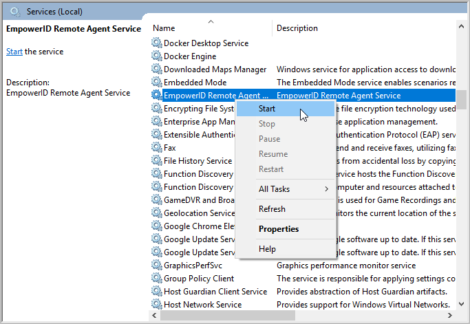 Open Services.msc and start the EmpowerID Remote Agent Windows service.