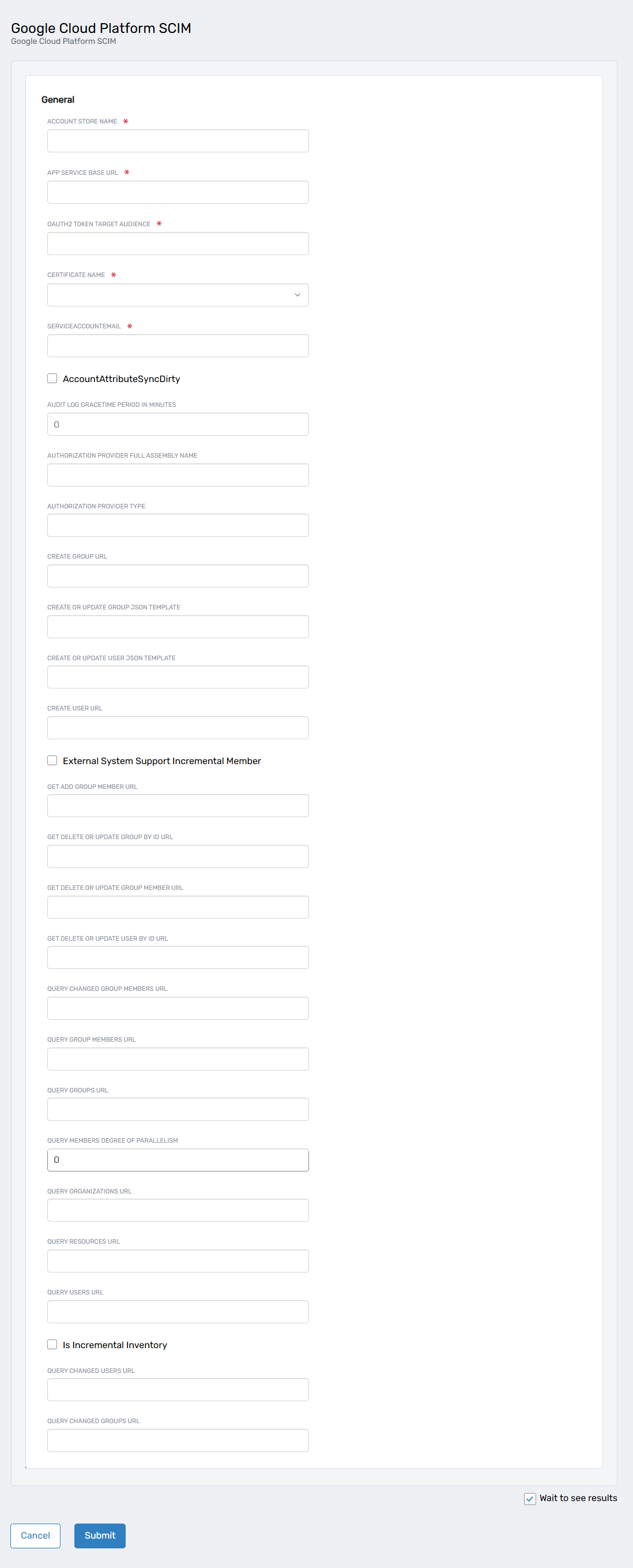 This opens the Google Cloud Platform SCIM form, which is where you enter the information needed to connect EmpowerID.