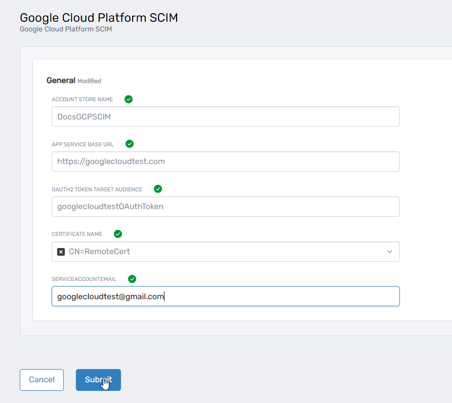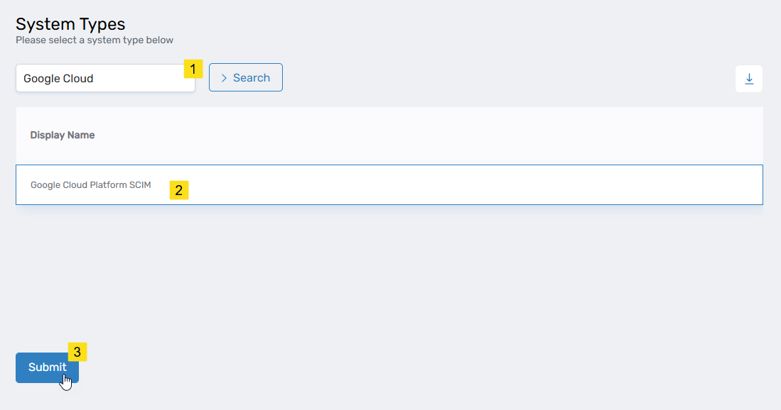 Under System Types, search for Google Cloud Platform SCIM, select the corresponding record, and click Submit.