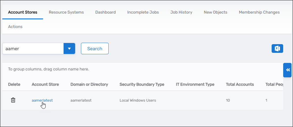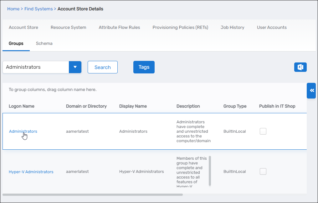 Search for the Local Windows account store with the groups you want to manage and click the Account Store link to navigate to the Account Store Details page for the account store.
