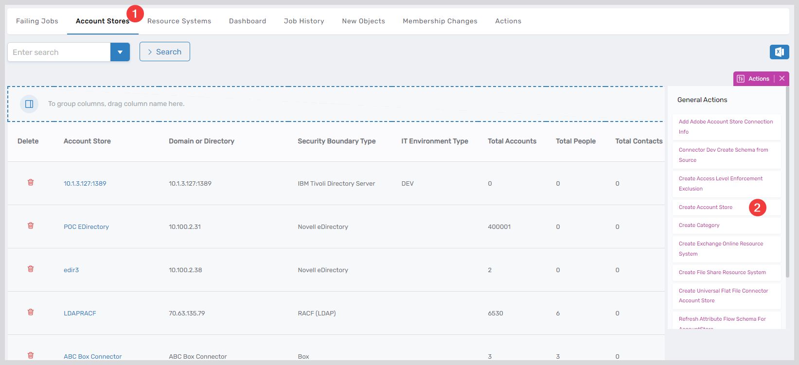 - Navigate to Admin > Applications and Directories > Account Stores and Systems and select the Account Stores tab.