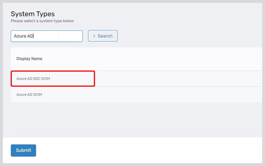 - Search for and select the EntraID B2C SCIM account store from the System Types menu, then click Submit.