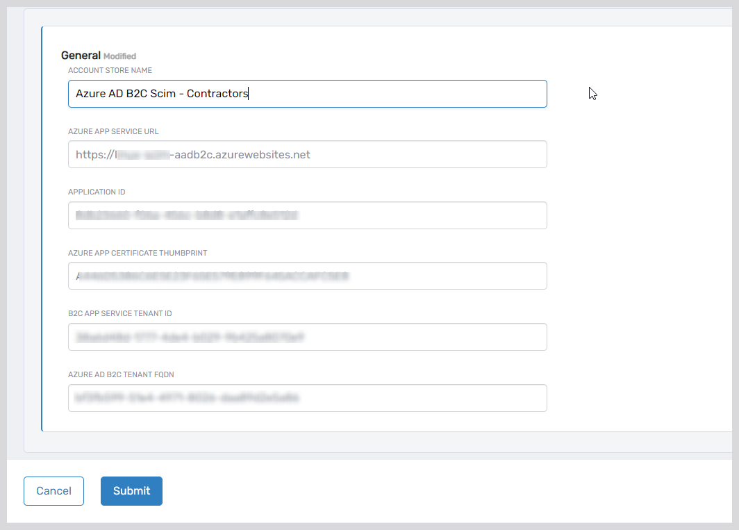 - Provide the following information for the account store and click Submit: