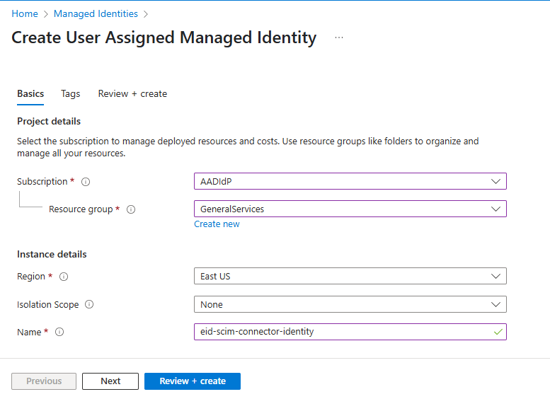 Click Create to create a new user-assigned managed identity.