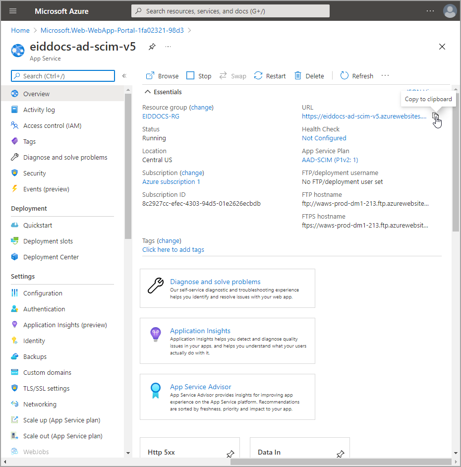 - After deployment completes, click Go to Resource and copy the URL from the Overview page. You will need this when you configure the app service for the EmpowerID EntraID SCIM Microservice.