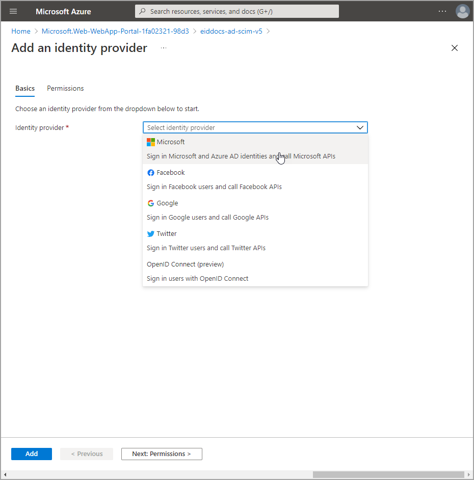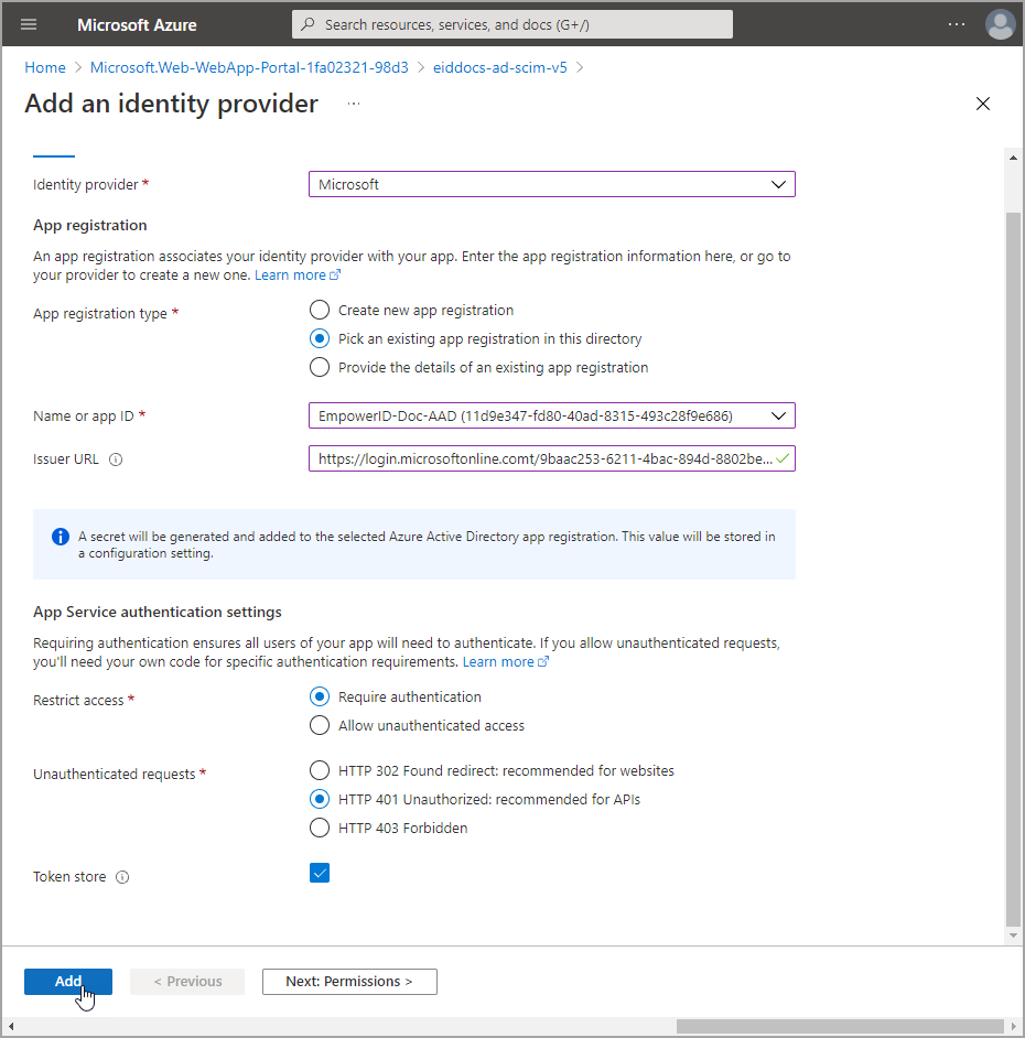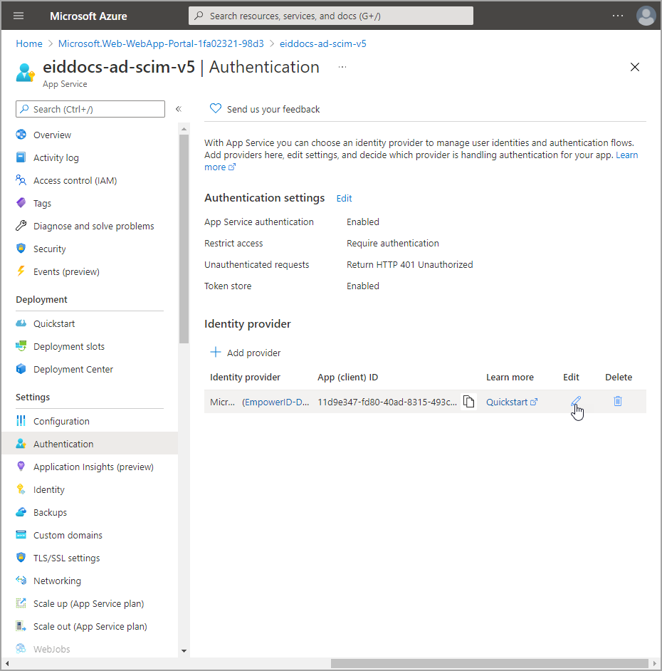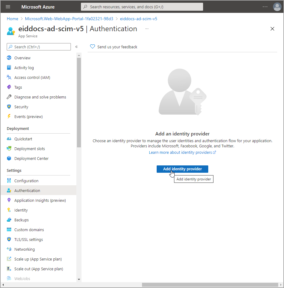 - Navigate to the Authentication blade for the app service and click Add identity provider.