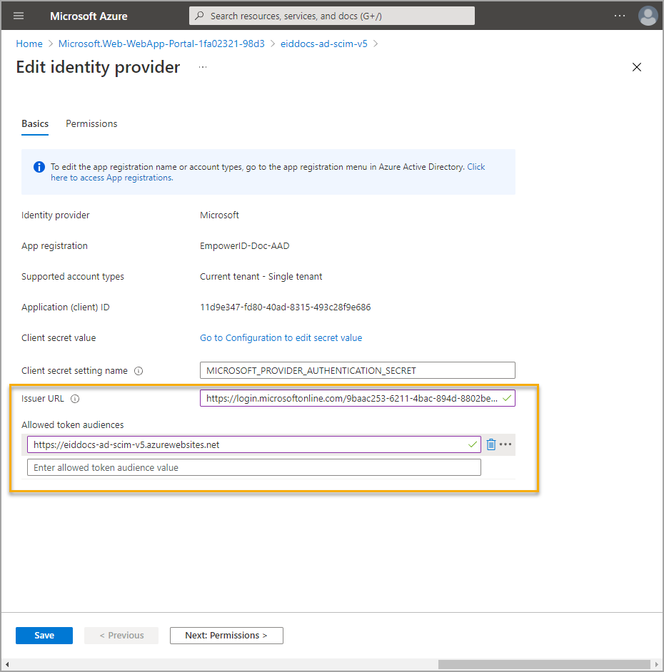 . - Under Allowed token audiences enter the URL for the app service.