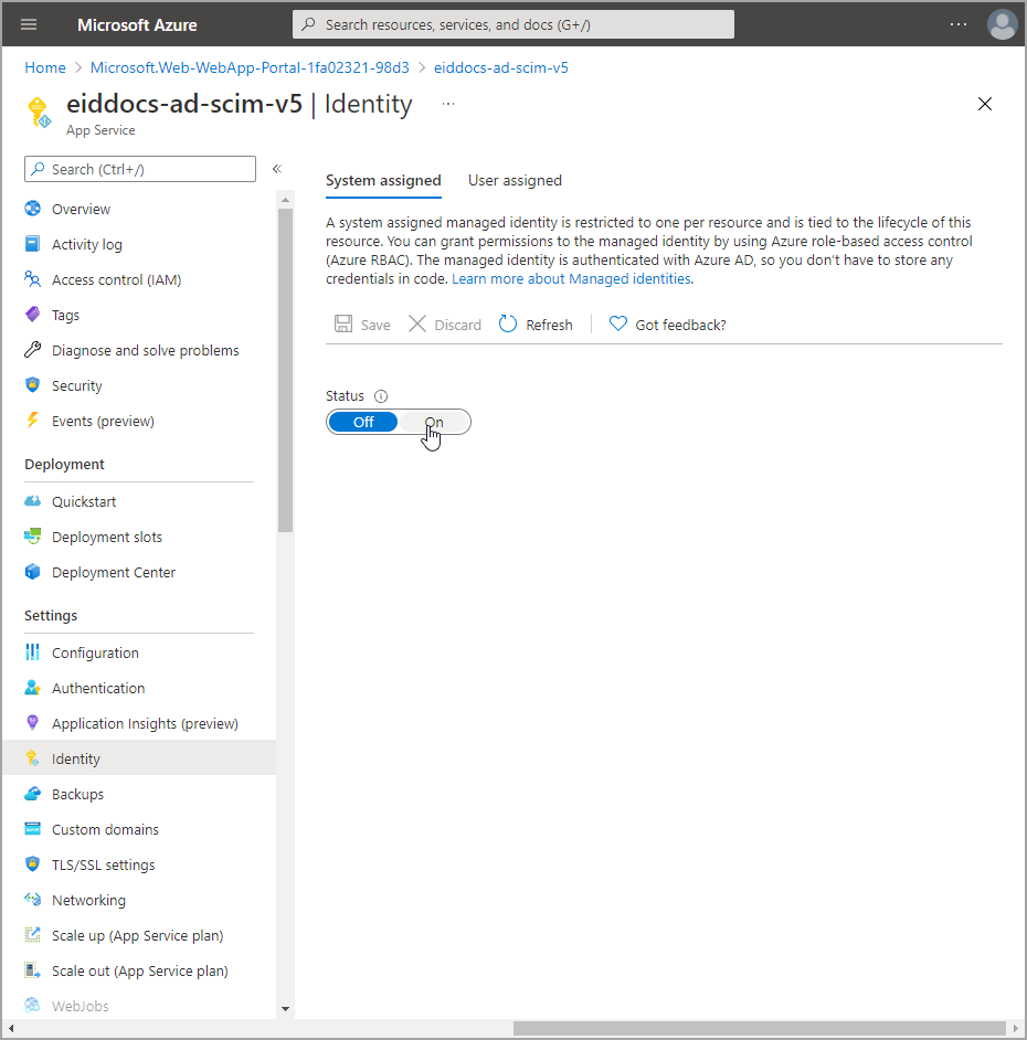 - Navigate to the Identity blade for the app service.