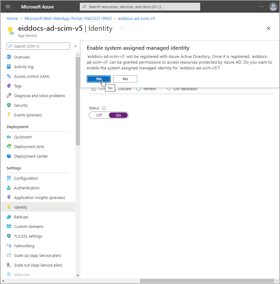 - Click Save and then click Yes to confirm that you want to enable system assigned managed identity.
