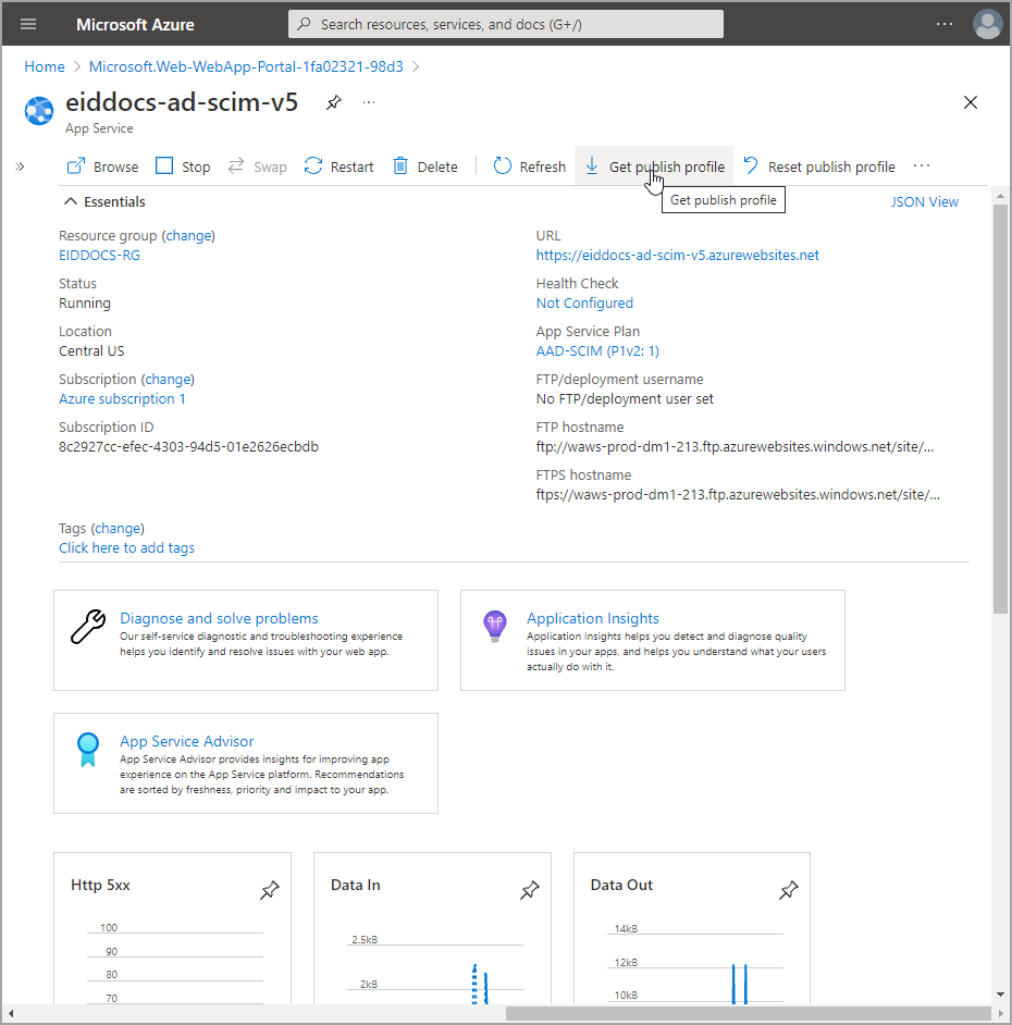 - Click Get publish profile and save the file to your machine. You use this file when publishing the EmpowerID EntraID SCIM microservice to Azure.