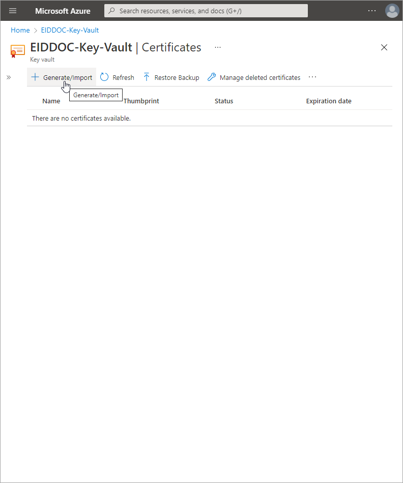 - Navigate to the Certificate page for the key vault and click Generate/Import.