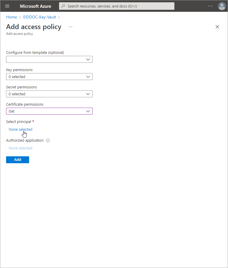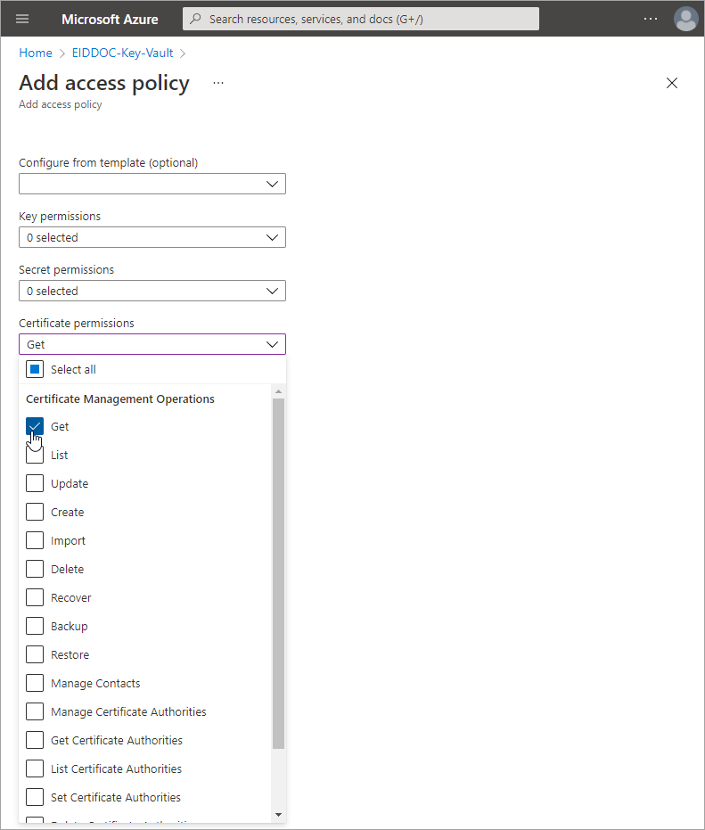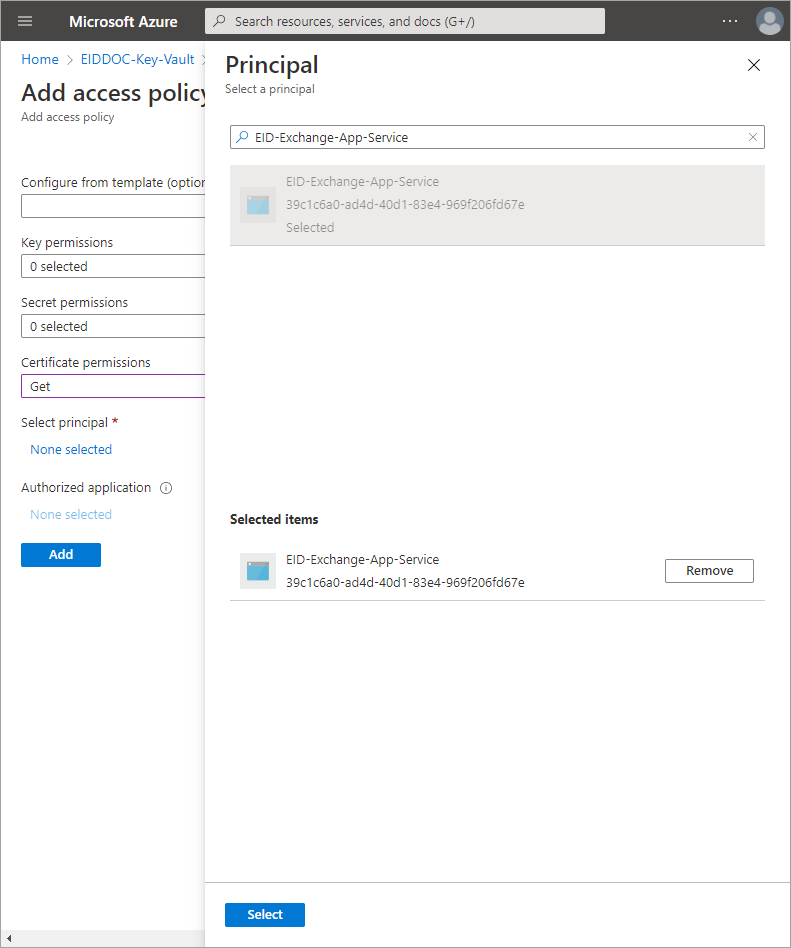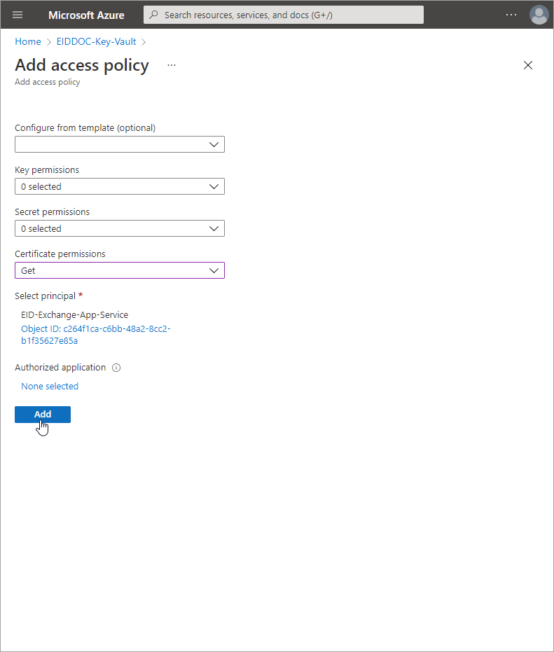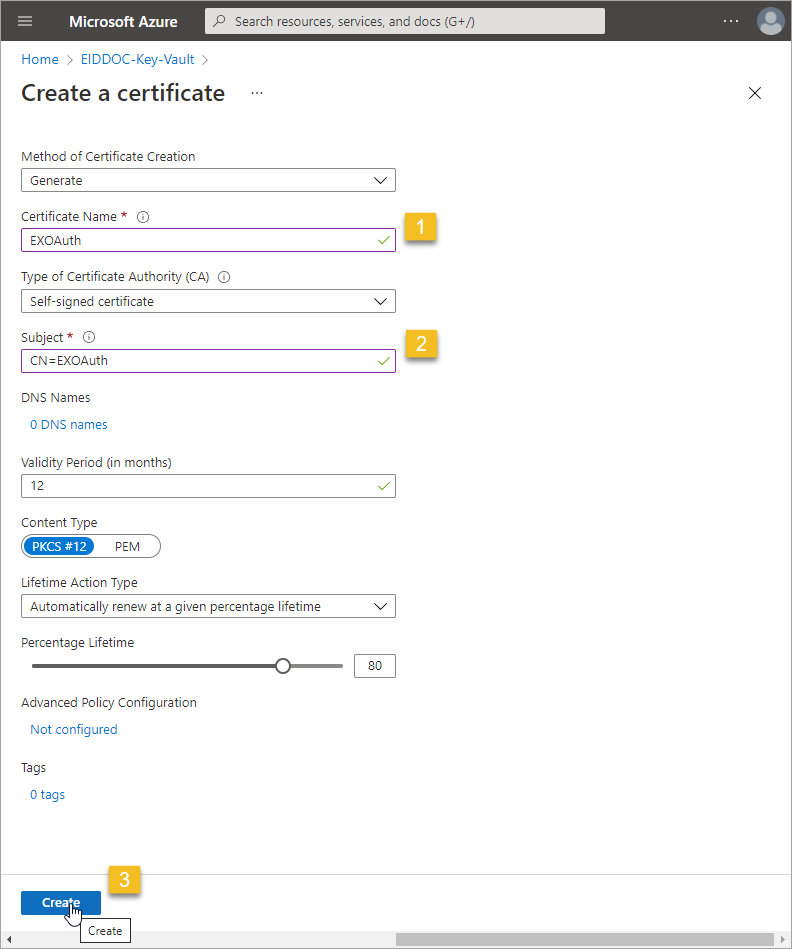 The Exchange Online microservice requires a key vault with a certificate for certificate-based authentication between the microservice and the service principal registered for it.