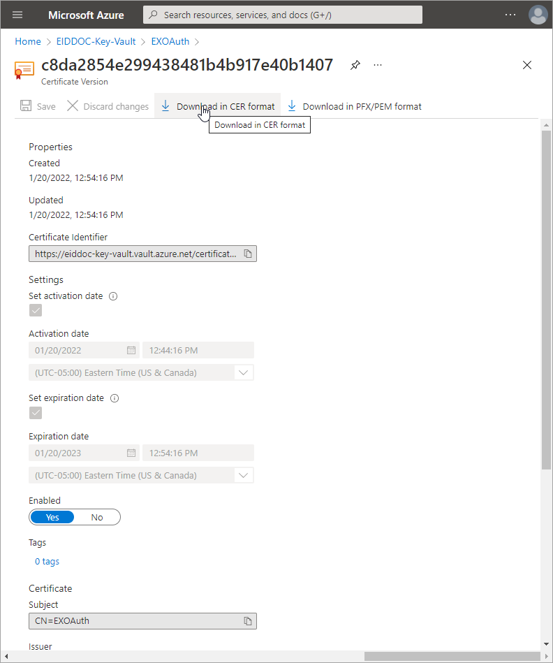 - After Azure creates the certificate, click the record for it and then download the certificate in CER format. You will add this to the service principal you created for the Exchange Online app service.