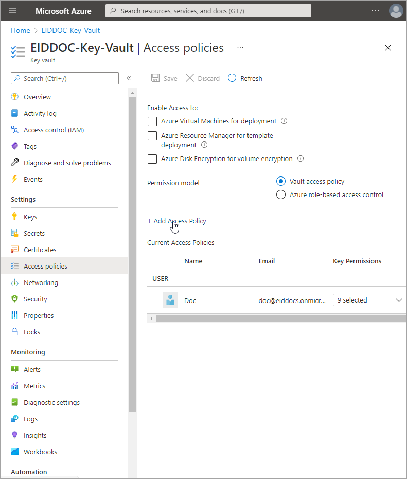 - In Azure, create a Key vault if you do not already have one or want to create a new one.