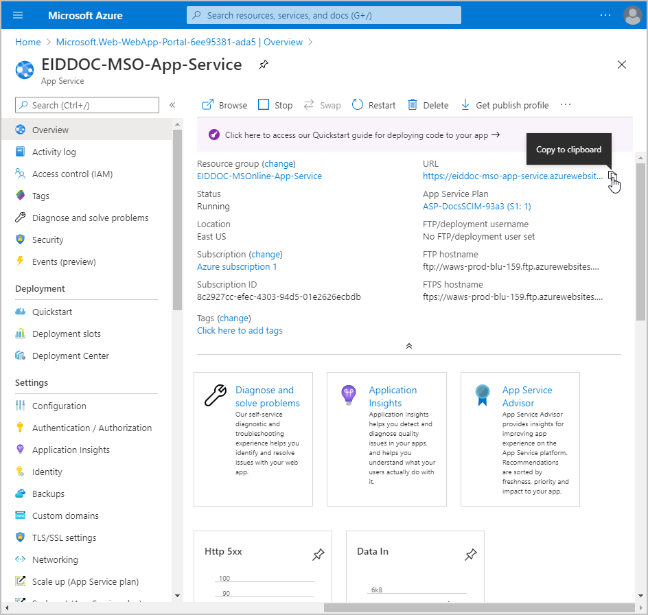 - On the Overview blade copy the App Service URL. You will need this when you configure the App Service for the MS Online microservice.