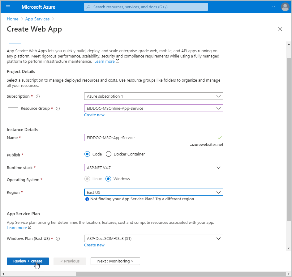 - Under Project Details, select a Subscription and then create a new Resource Group for the App Service.