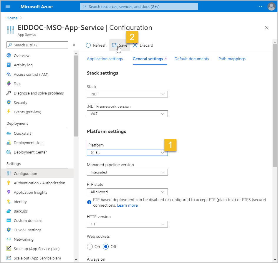 - Change the platform for the App Service to 64 Bit by doing the following: