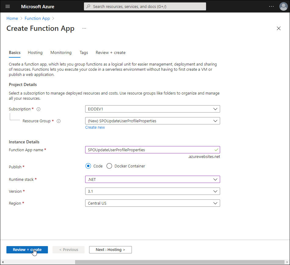 Next, create the Function app as shown below.