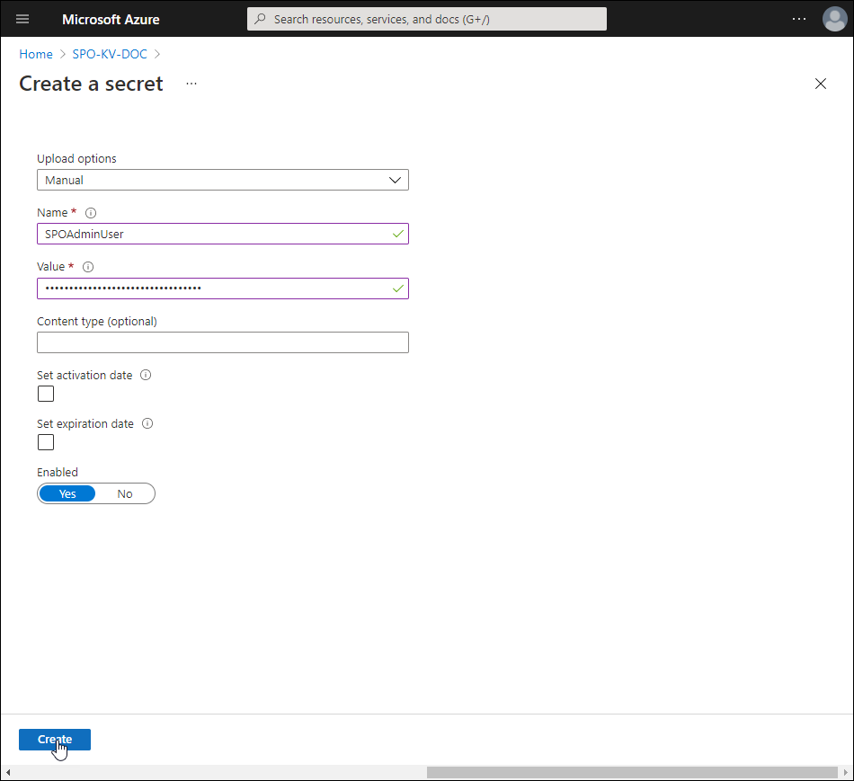Example:@Microsoft.KeyVault(SecretUri=https://spo-kv-doc.vault.azure.net/secrets/SPOAdminUser/1130f7ee4d904068a18e2eefb2c1287f)