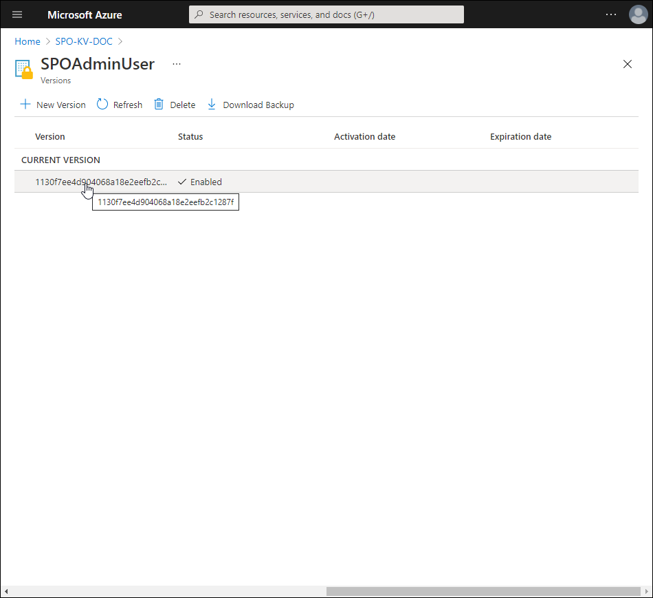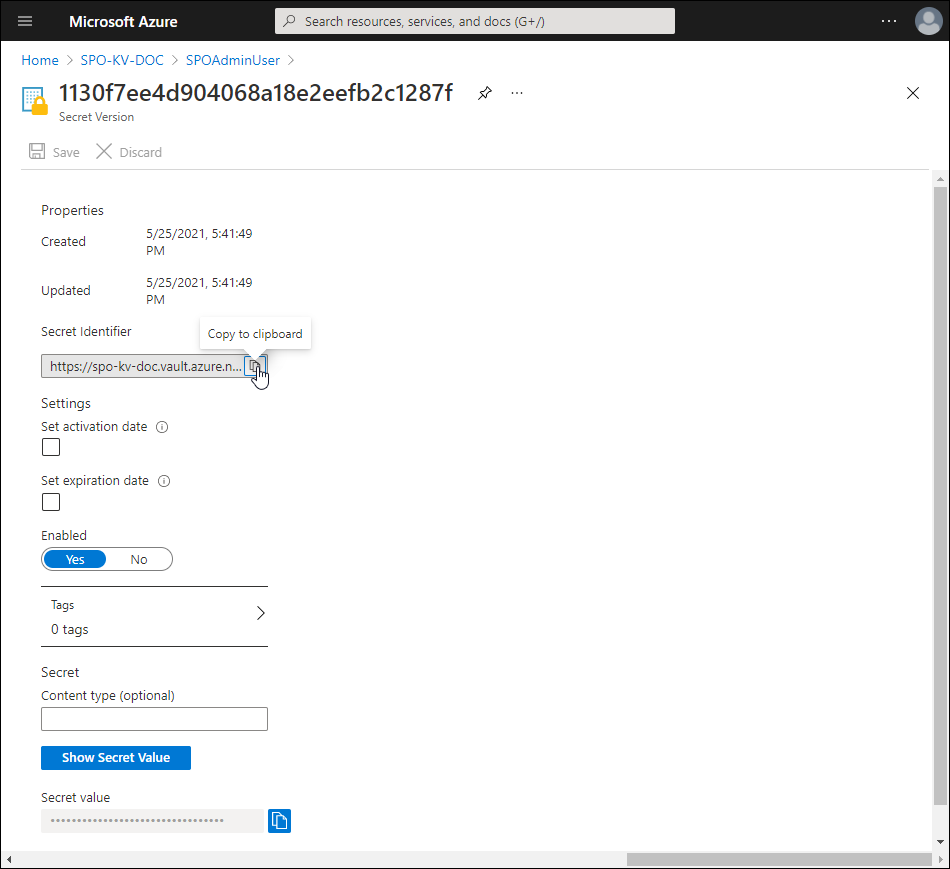- Click the Current Version to go to the Properties blade for the secret.