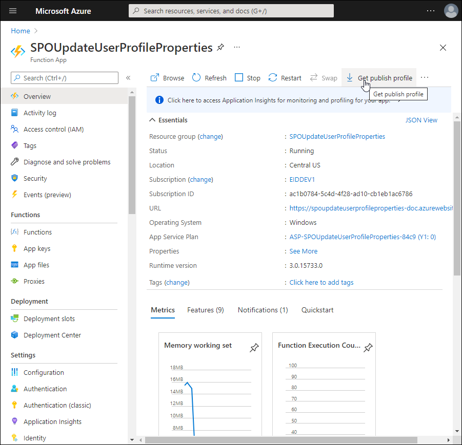 - Go to the Overview page for the Function app and download the publish profile file for the app. You use this when deploying the function app in EmpowerID to Azure.