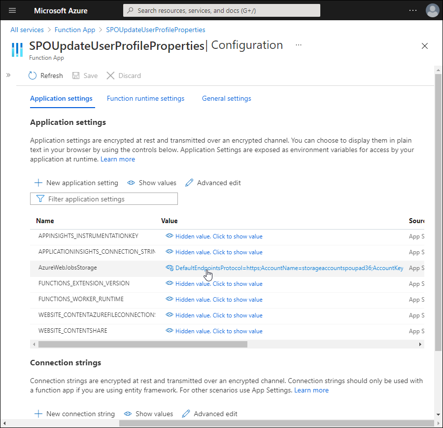 Navigate to the Configuration page and copy the Value for AzureWebJobsStorage. You need this value when adding application settings to the SPO app service.