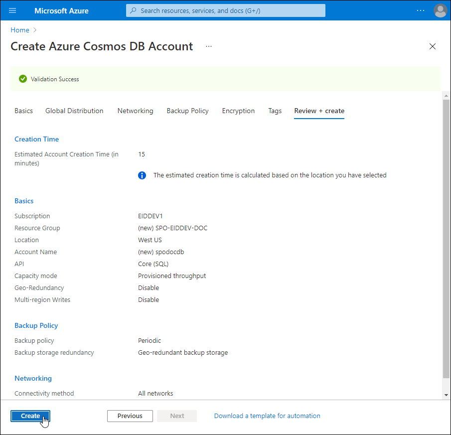 - Review the settings and make any adjustments needed for your environment and then click Create.