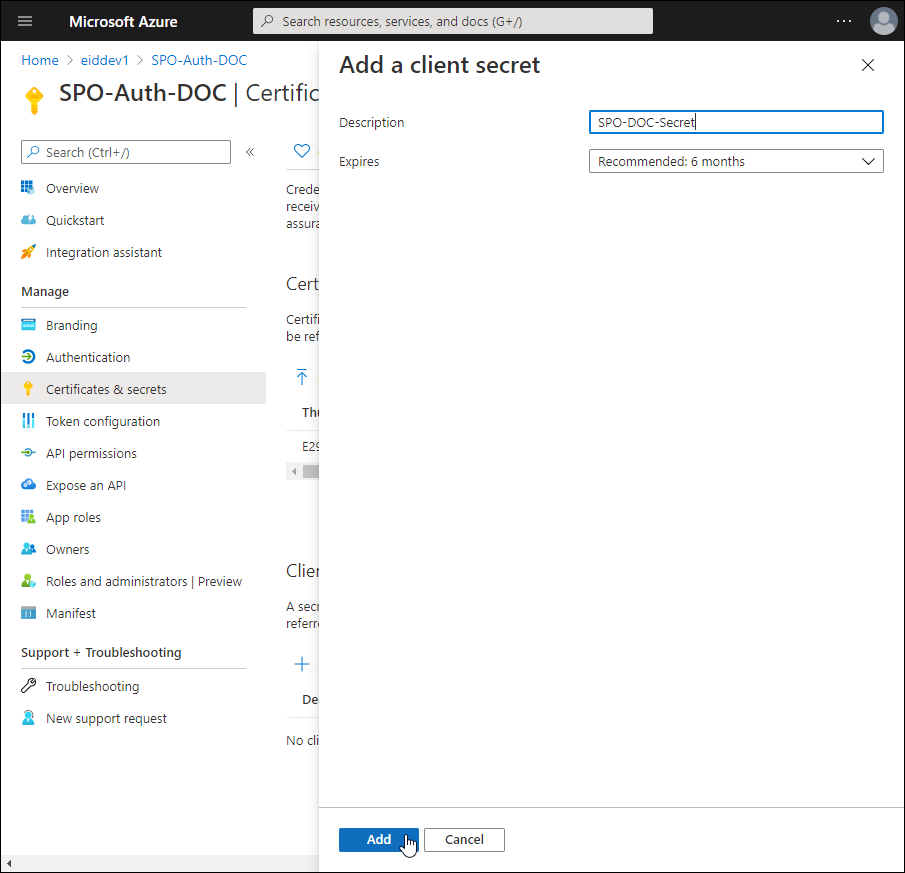 - Add a client secret and copy the value. You add this value to the Key Vault in your EmpowerID tenant.