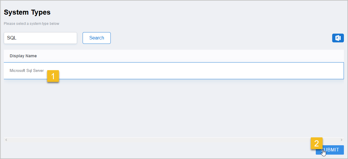 - Click Microsoft Sql Server to select the type and then click Submit.