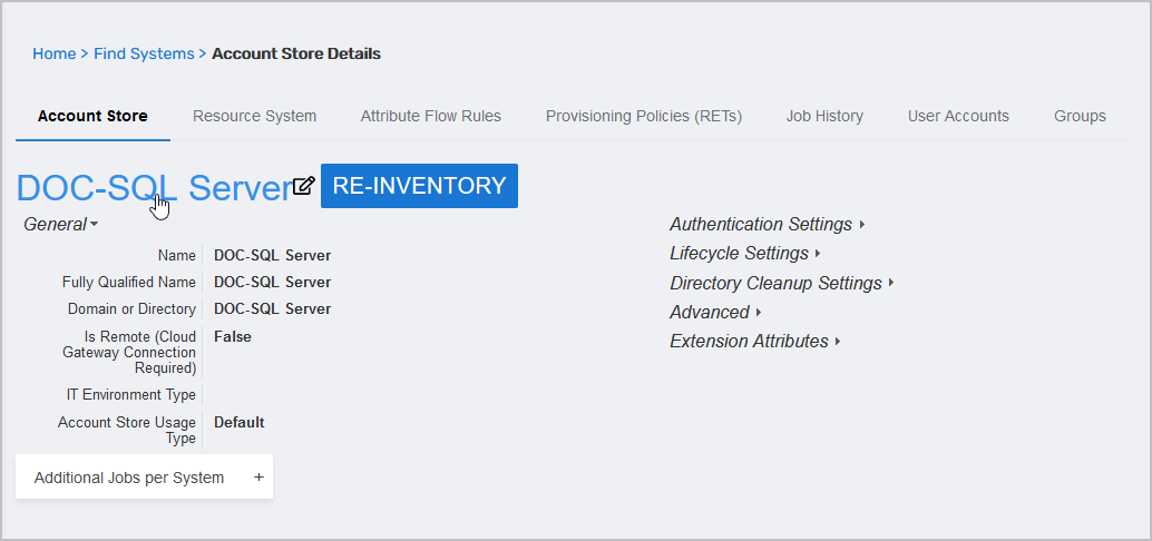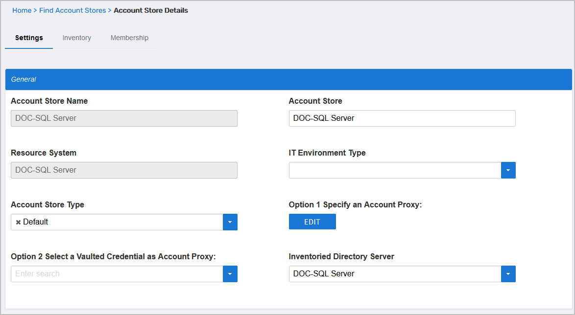 Account Store Settings Setting Description General Settings IT Environment Type Allows you to specify the type of environment in which you are creating the account store. Account Store Type Allows you to categorize the account store in order to filter resource objects appearing to users based on the type of account store. Types include: - Default