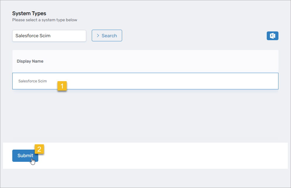 - Click the Salesforce Scim record to select the type and then click Submit.