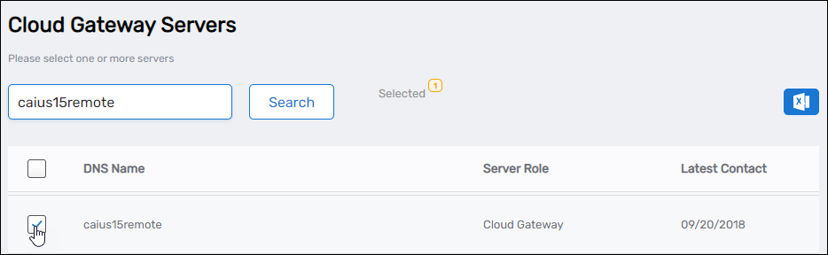 - If you selected Is Remote (Requires Cloud Gateway), search for and select one or more cloud gateway servers and then click Submit. You will not see this screen if you did not select Is Remote (Requires Cloud Gateway).