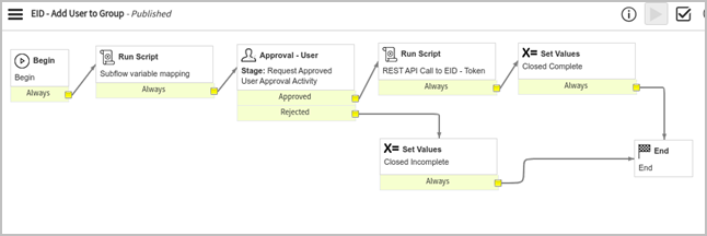This workflow is built to add users to a group within EmpowerID. When a request is submitted using this workflow, it runs a script block named “Subflow variable mapping”. This is an important step in case we want to use the EmpowerID workflow as a subflow in an existing customer workflow. The second step is the Approval activity, which is currently approved by the system administrator. Once approved (if rejected, the workflow sets the state of the request as “closed incomplete” and ends here), the workflow continues to the third step, which is where the actual API call to EmpowerID is made with all required parameters. Please refer to this article's Integrations section to know the API's details. After a successful call, the workflow marks the state of the RITM as “Closed Complete” and ends.