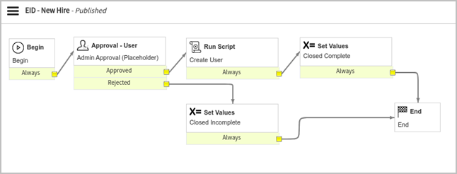 This workflow is built to create a new user using the EmpowerID APIs. The workflow invokes the Admin Approval activity when a new hire request is submitted. Currently, this is a placeholder activity that sends an approval request to the system administrator to demonstrate approvals. Once approved by the system admin (If rejected, the request is marked as “closed incomplete,” and the workflow ends.), the workflow proceeds to execute the Run Script block. This block receives the input parameters from the submitted request form and triggers the API call to EmpowerID using these details. The details about the API call can be found in the Integrations section of this document. Once the call is made, the request is marked as “closed complete,” and the workflow ends.