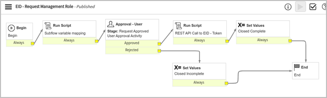 This workflow is built to associate a management role to a user within EmpowerID for a specified duration of time. At the very beginning, the workflow runs a script block that deals with variable mapping in the case when this workflow is being used as a subflow. The second step is the approval activity, which is currently approved by the system administrator. Once approved (if rejected, the workflow sets the state of the request as “closed incomplete” and ends here), the workflow continues to the third step, which is where the actual API call to EmpowerID is made with all required parameters. After the successful call, workflow marks the state of the RITM as “Closed Complete” and ends.
