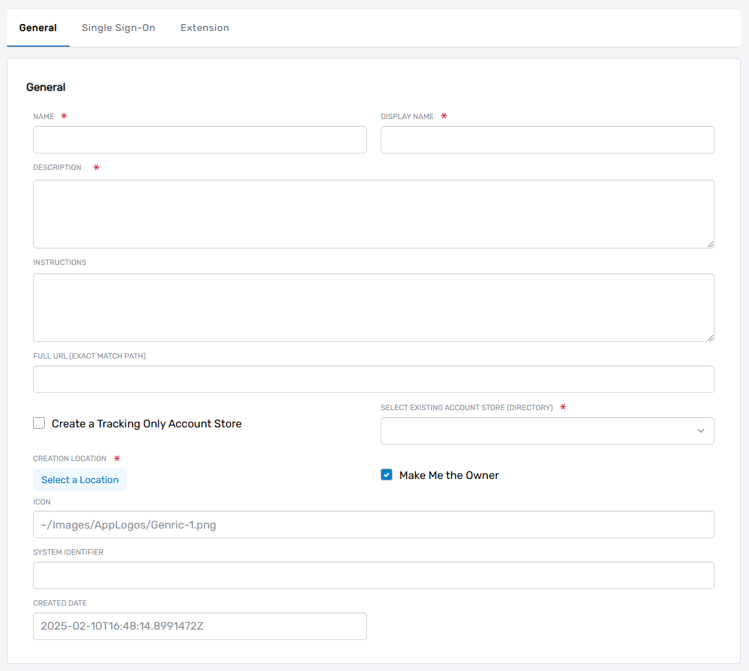 This opens the Application Details form, which contains various tabs and fields for creating the application.